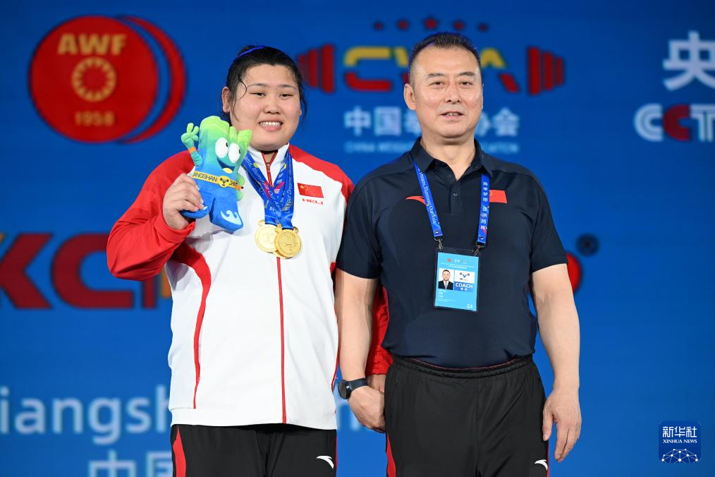 5月15日,中国选手李闫(左)与教练刘尧在颁奖仪式后合影。最终,李闫获得抓举、挺举、总成绩三项冠军。