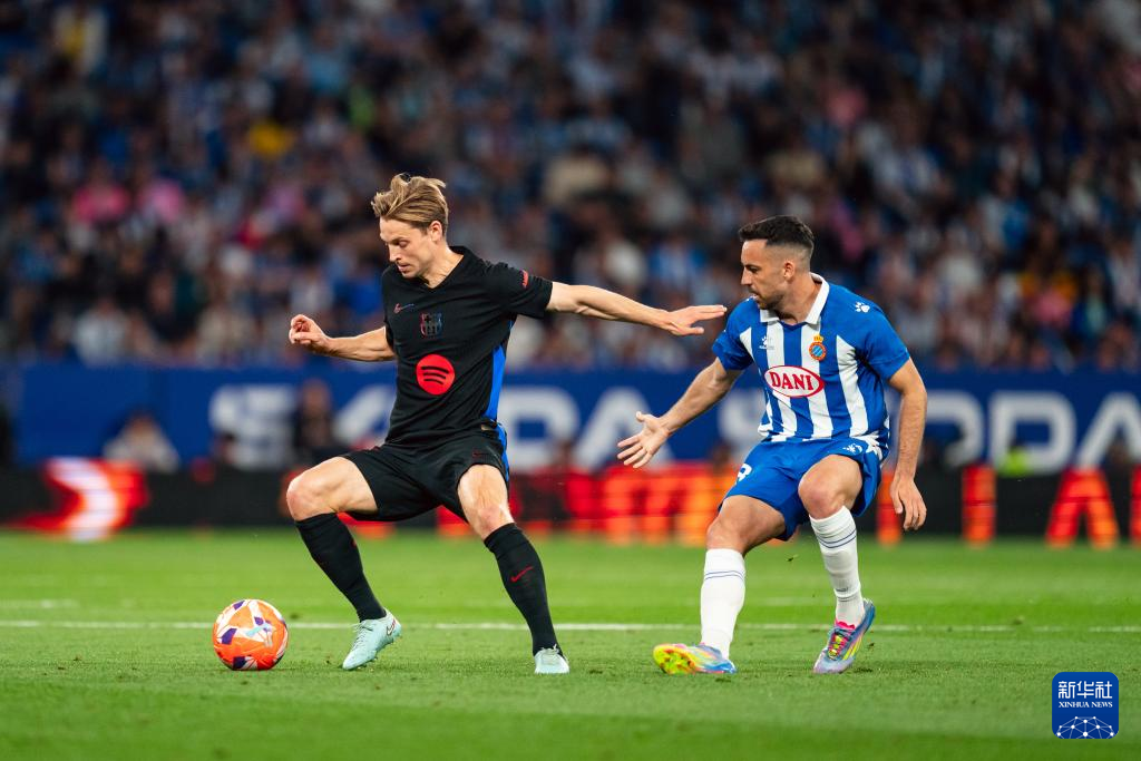 5月15日,巴塞罗那队球员德容(左)和西班牙人队球员埃克斯波西托在比赛中拼抢。
