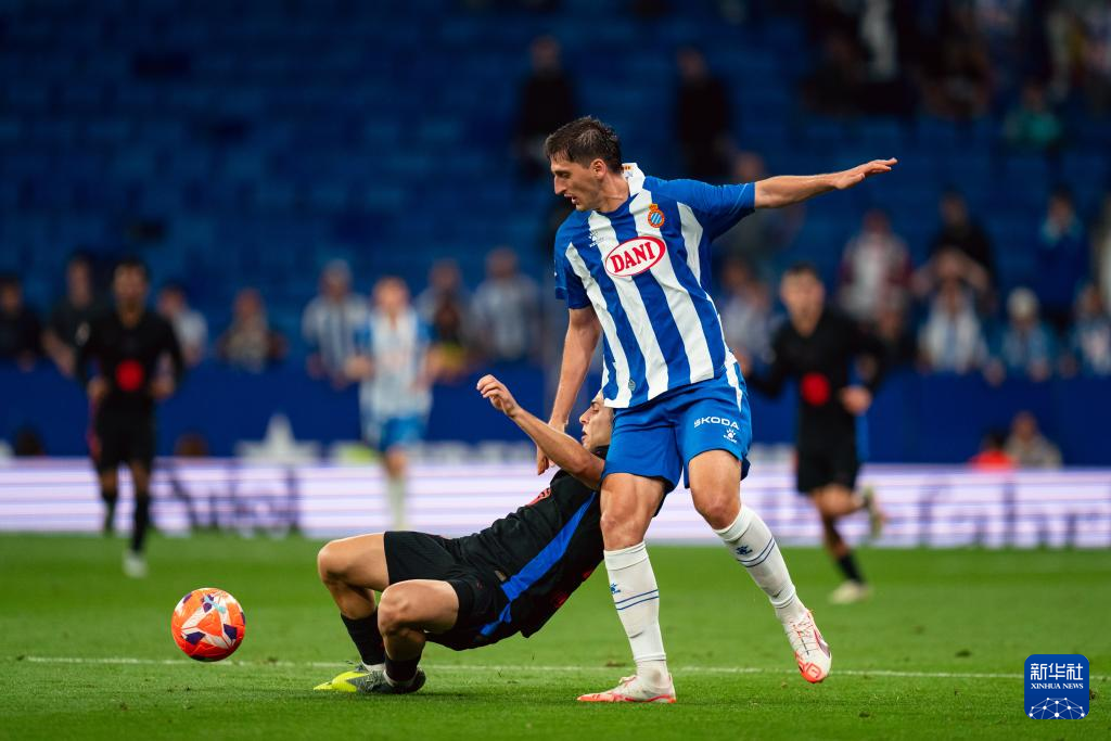 5月15日,巴塞罗那队球员亚马尔(右)与西班牙人队球员昆布拉在比赛中拼抢。