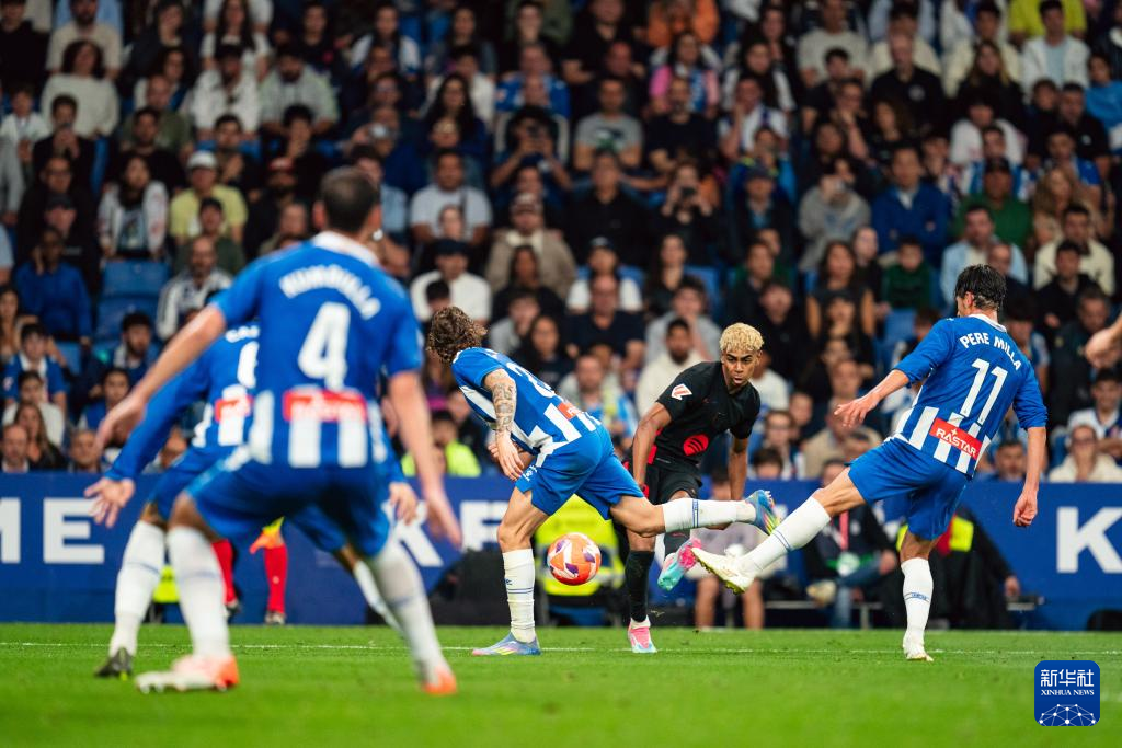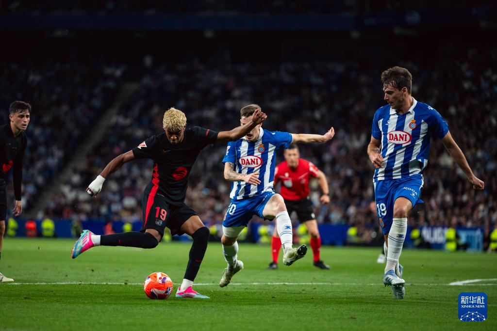 5月15日,巴塞罗那队球员亚马尔(右二)在比赛中传球。