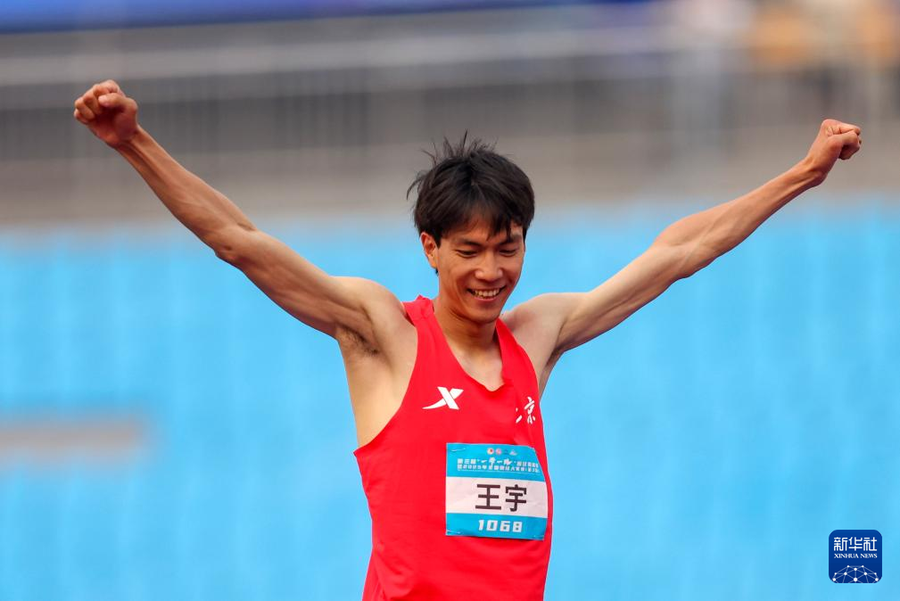 5月15日,北京队选手王宇在试跳成功后庆祝。最终,他位列第五。