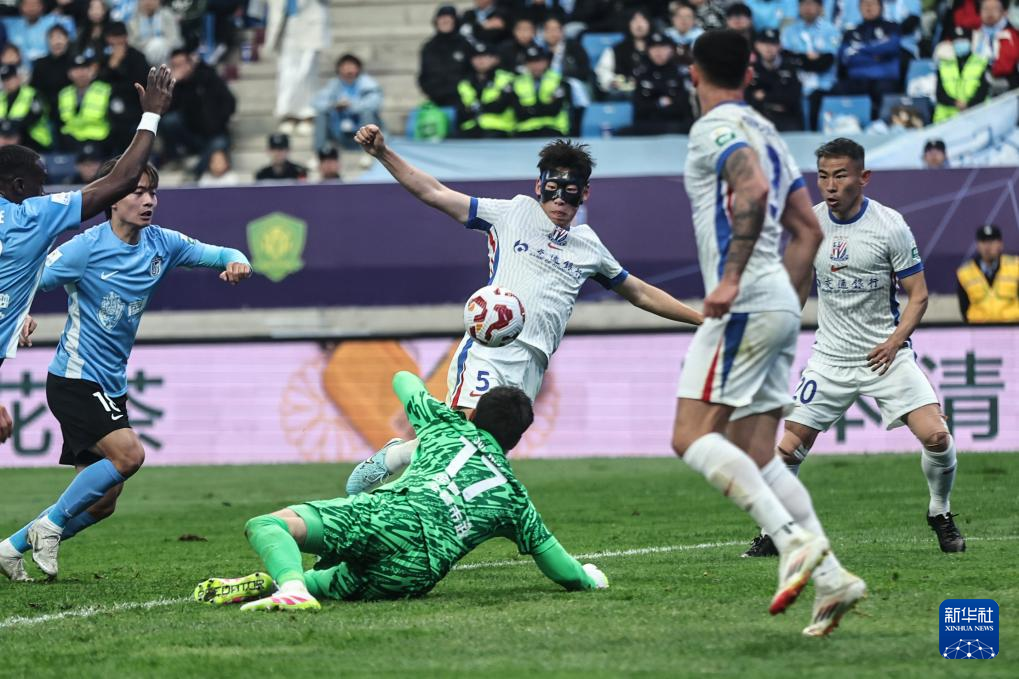5月17日,上海申花队球员绍洛·米内罗(中)在比赛中射门得分。