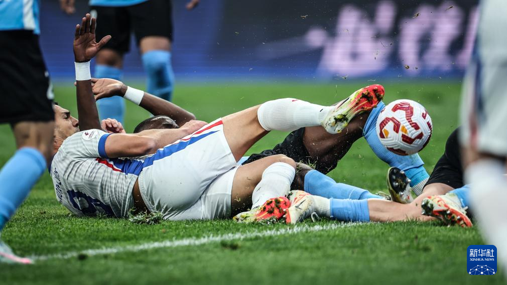 5月17日,上海申花队球员安德烈·路易斯(下前)在比赛中倒地拼抢。