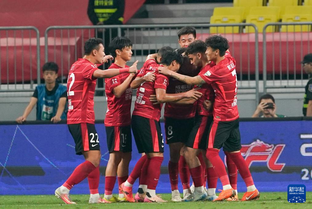 5月17日,成都蓉城队球员在比赛中庆祝进球。