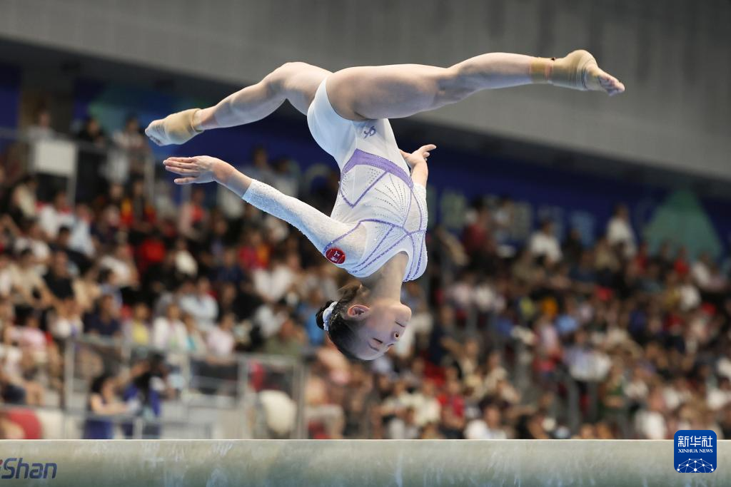 5月18日,广东思腾队选手柯沁沁在女子团体决赛平衡木比赛中。最终,广东思腾队获得亚军。