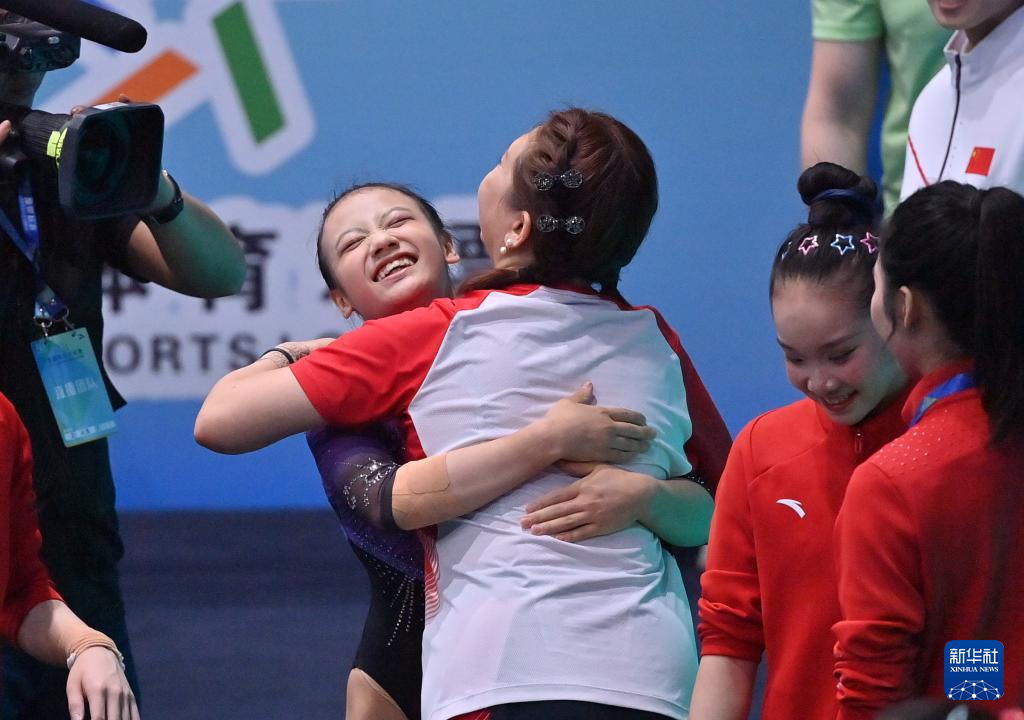 5月18日,河南队选手张晓轩(左)在女子团体决赛高低杠比赛后与队友张婉宁拥抱庆祝。最终,河南队获得季军。