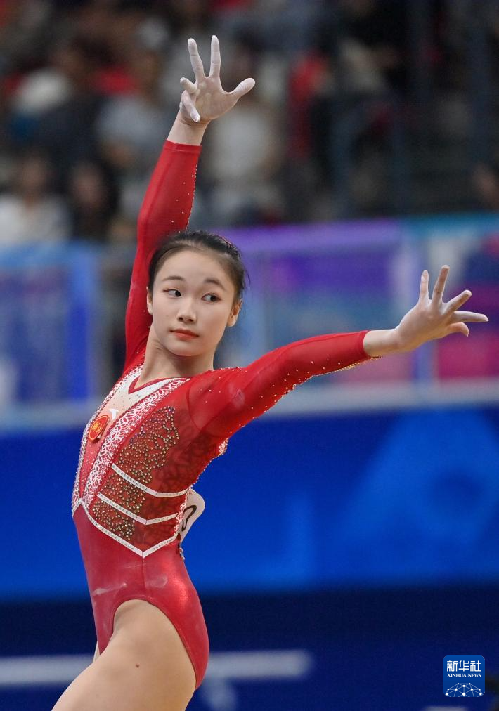 5月18日,浙江队选手张欣怡在女子团体决赛自由操比赛中。最终,浙江队夺得冠军。
