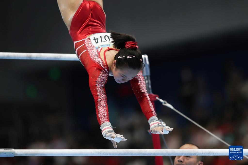 5月18日,浙江队选手张欣怡在女子团体决赛高低杠比赛中。最终,浙江队夺得冠军。
