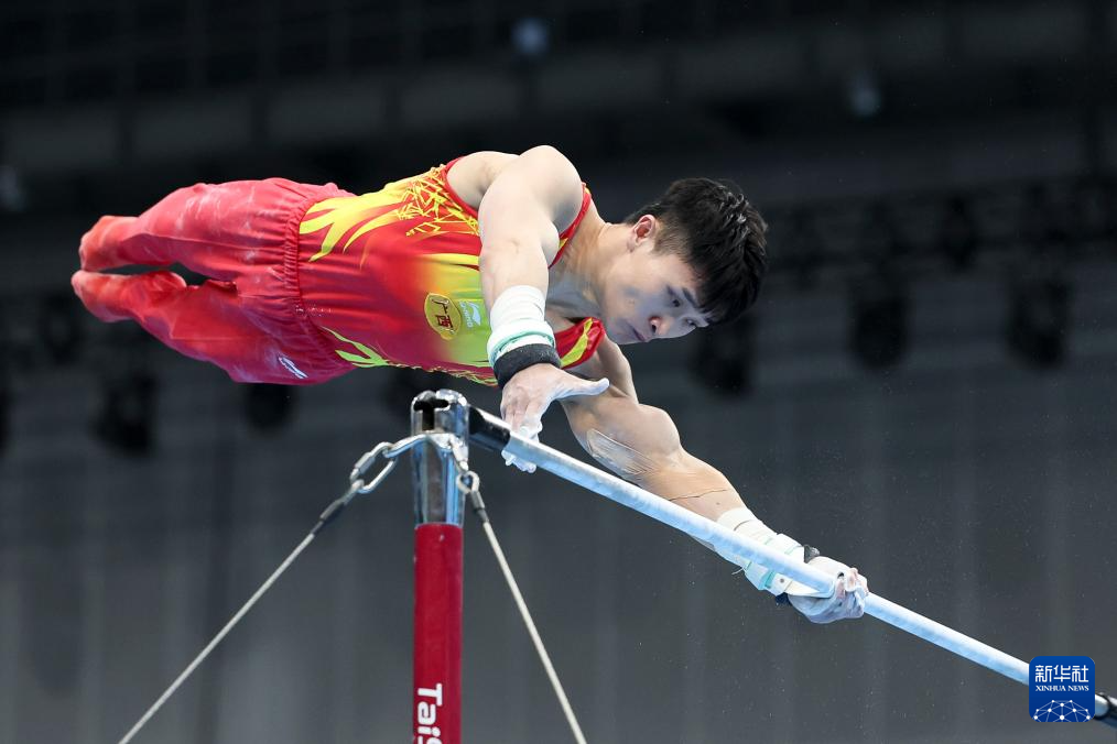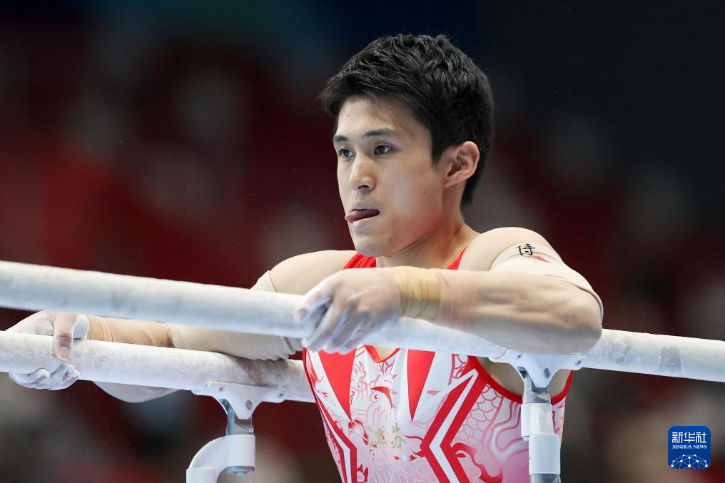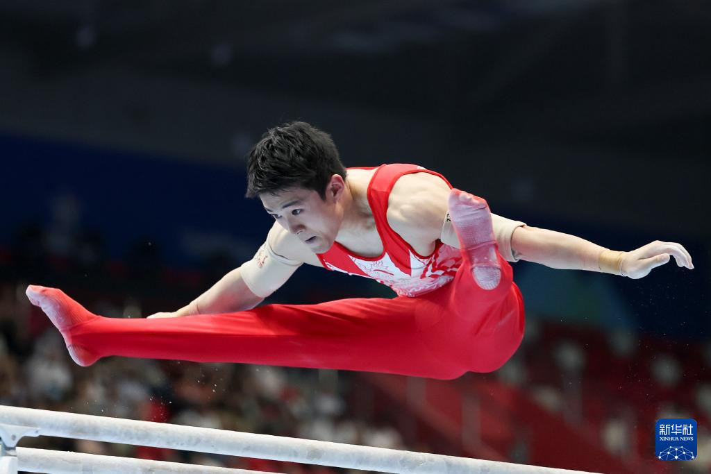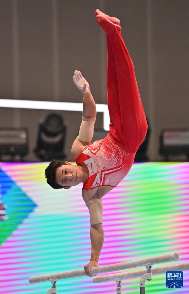 5月19日,江苏队选手侍聪在双杠比赛中。最终,他获得男子个人全能亚军。