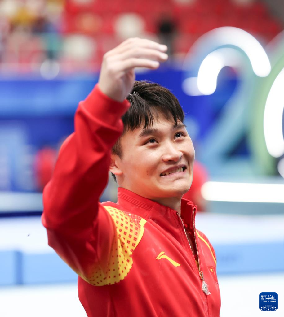 5月19日,广西队选手兰星宇在单杠比赛后向观众致意。最终,他获得男子个人全能季军。
