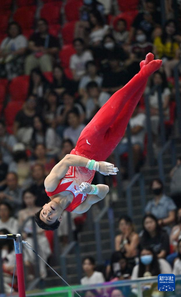 5月19日,江苏队选手侍聪在单杠比赛中。最终,他获得男子个人全能亚军。