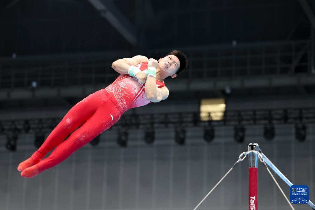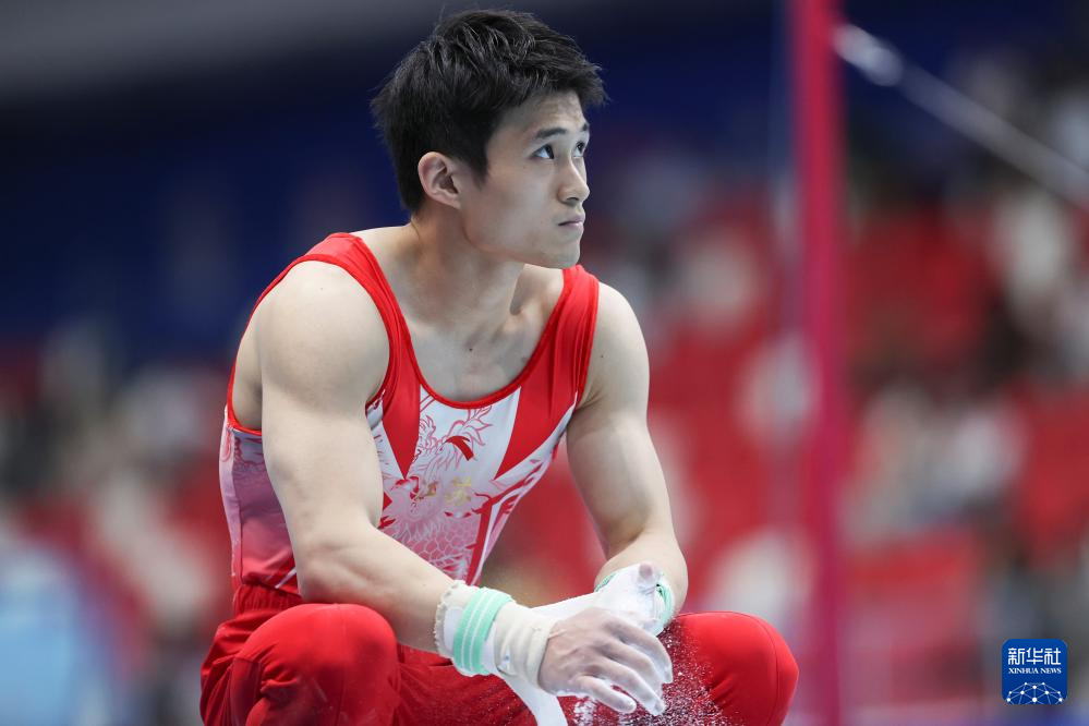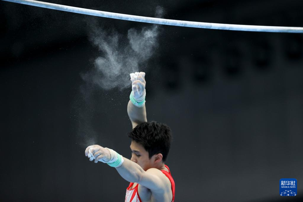 5月19日,江苏队选手侍聪在单杠比赛前准备。最终,他获得男子个人全能亚军。