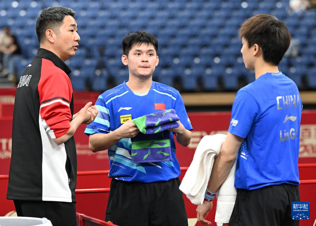 5月19日,林高远(右)/林诗栋(中)在比赛间隙接受教练指导。