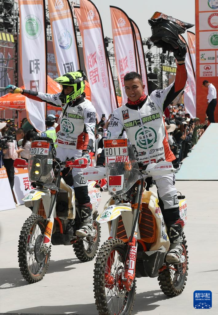 5月20日,新疆八一钢铁车队车手阿巴斯·加帕尔(右)和艾孜海尔·加帕尔在发车仪式上。