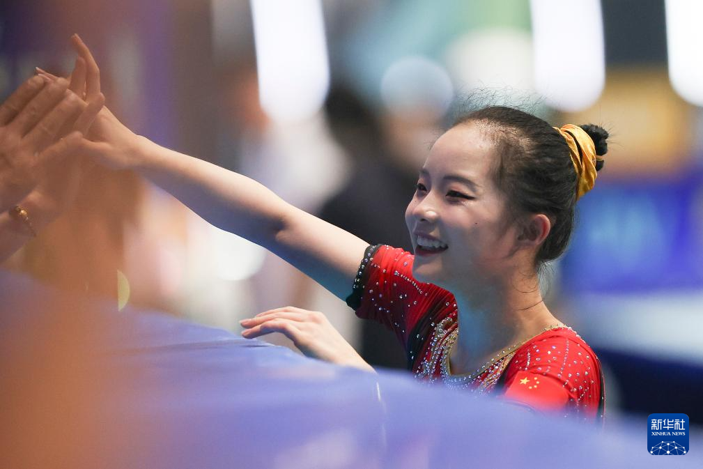 5月20日,上海队选手秦心怡在平衡木比赛后致意。最终,她获得女子个人全能亚军。