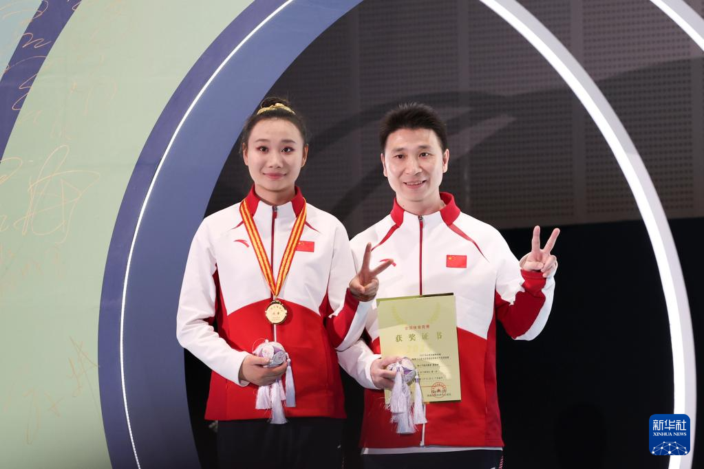 5月21日,冠军云南队选手杨凡予微(左)与教练殷晓峰在颁奖仪式后合影。