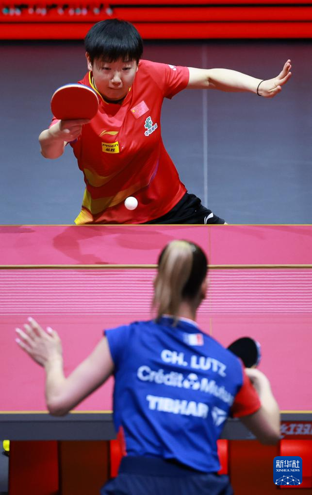 5月21日,孙颖莎(上)在比赛中回球。