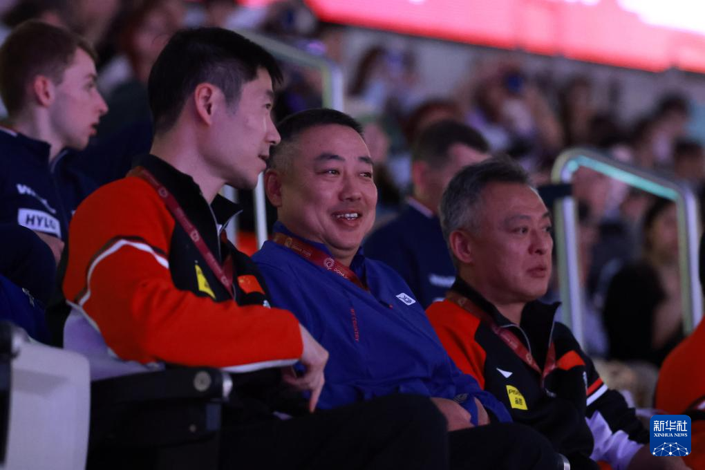 5月21日,中国乒协主席王励勤(前左)、国际乒联第一副主席、世界乒乓球职业大联盟(WTT)董事会主席刘国梁(前中)在看台上交流。