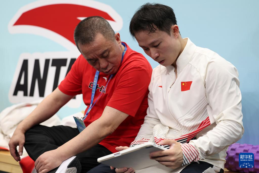 5月21日,陈治龙(右)在比赛后与教练秦卫交流。