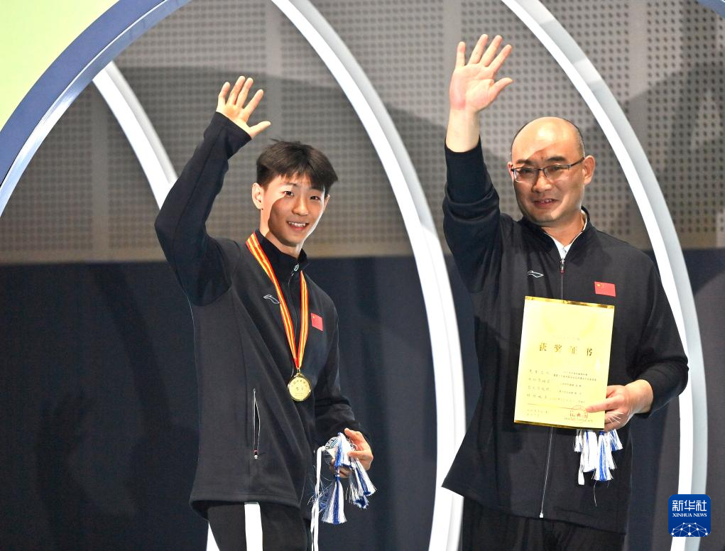 5月21日,王浩宇(左)和教练葛晓通在颁奖仪式上。
