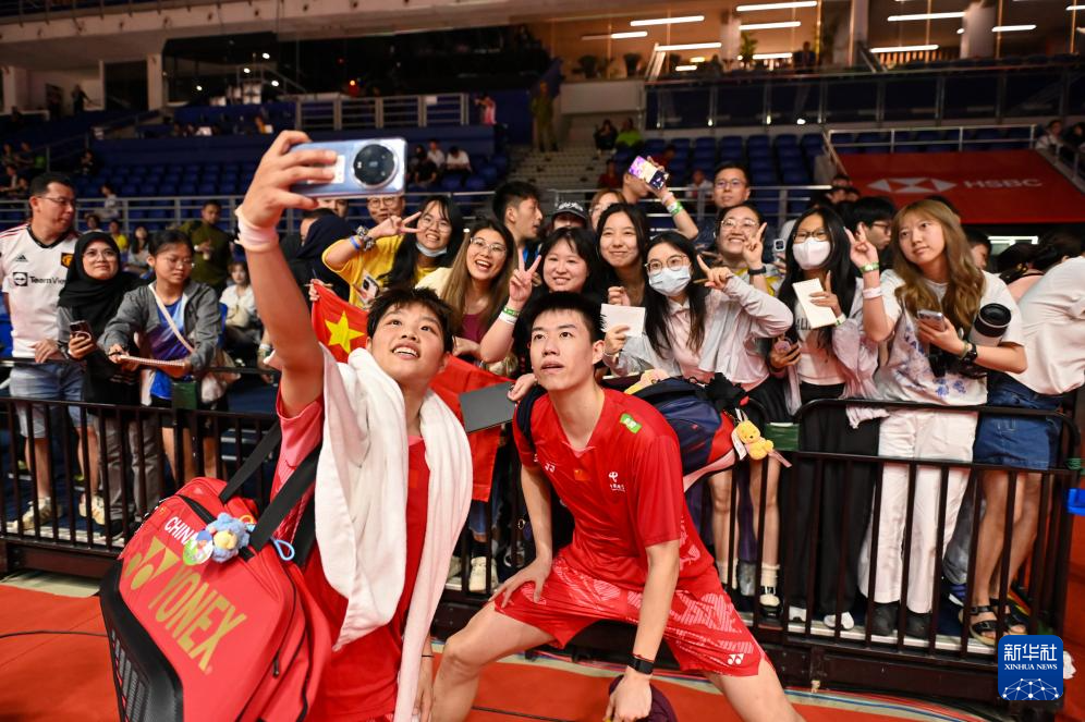 5月23日,冯彦哲(前右)/黄东萍(前左)在比赛后与球迷自拍合影。