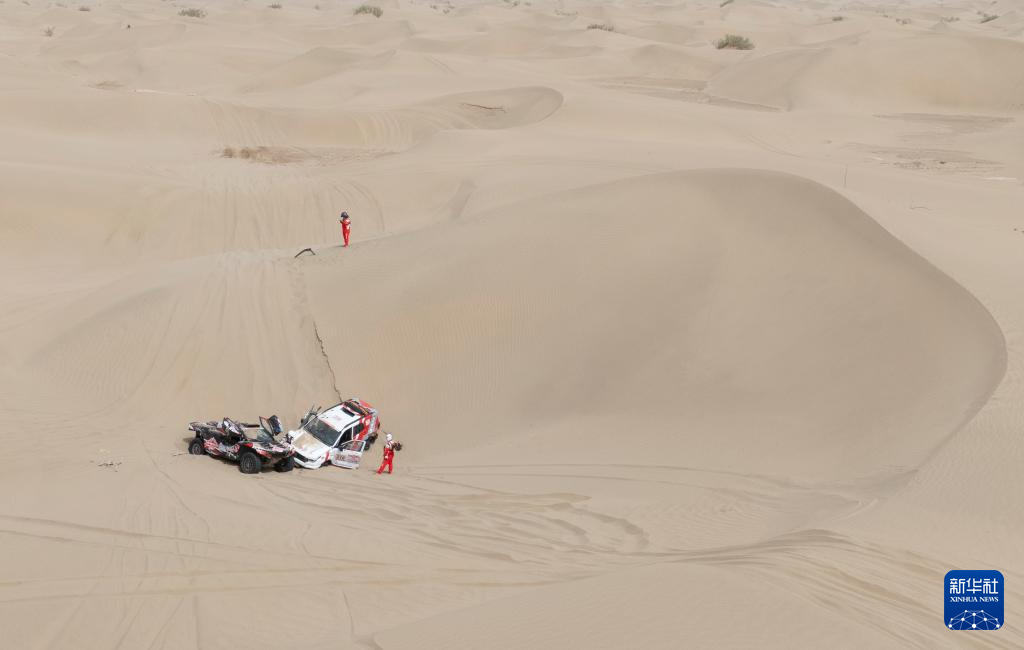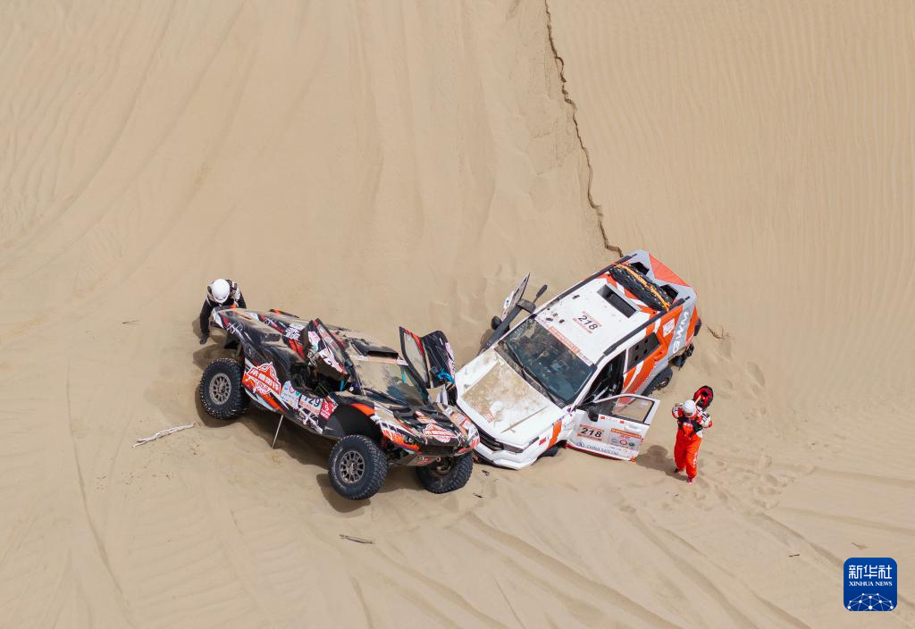 5月22日,长城坦克Hi4车队车手李鹏玉、领航员胡悦驾驶的赛车(右)和承德雷锋琦速驿站CR6车队车手李新禹、领航员王翼荣驾驶的赛车在比赛中发生事故(无人机照片)。