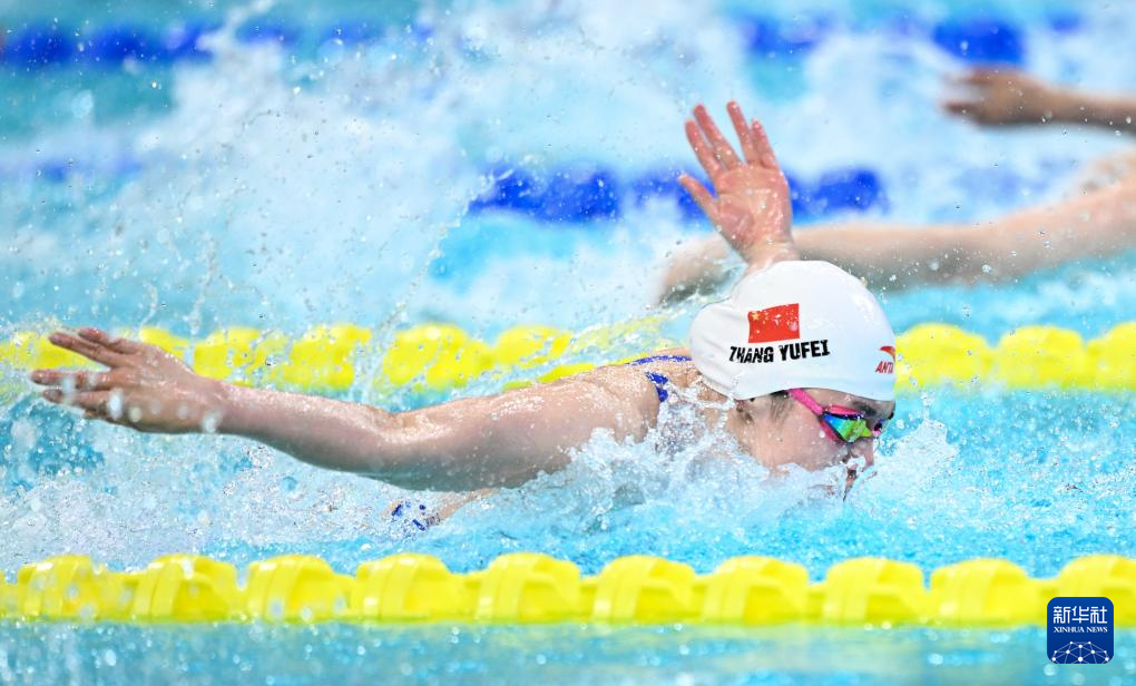 5月22日,张雨霏头戴印有蝴蝶图案的泳帽参赛。