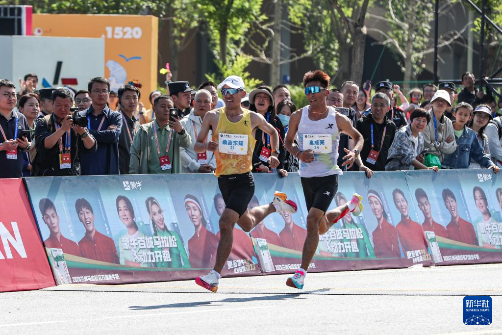 5月25日,中国选手桑吉东知(前左)和高成亮(前右)在比赛中冲刺。最终,桑吉东知以2小时19分14秒35的成绩获得马拉松男子组中国籍参赛选手第二名,高成亮以2小时19分14秒84的成绩获得马拉松男子组中国籍参赛选手第三名。