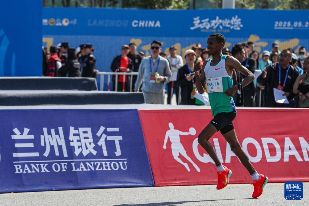5月25日,埃塞俄比亚选手戈萨·安贝鲁·查拉在比赛中冲刺。最终,他以2小时12分06秒的成绩获得马拉松男子组季军。
