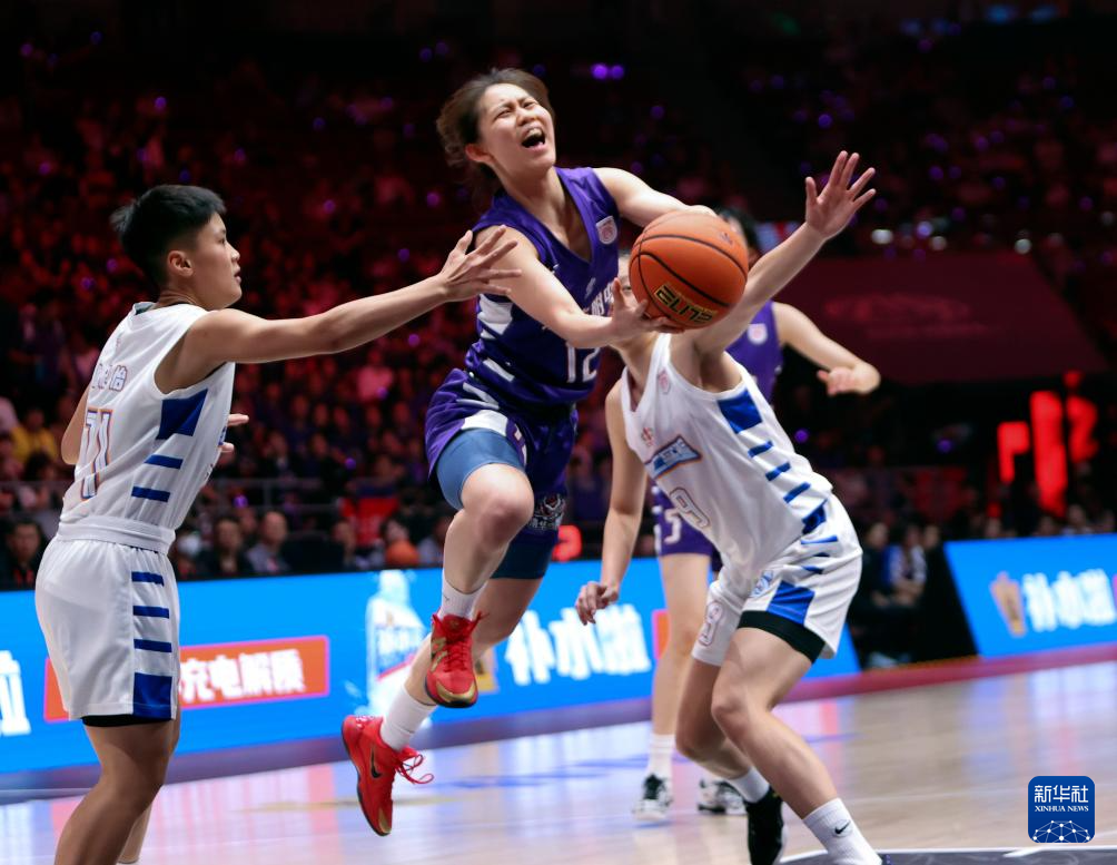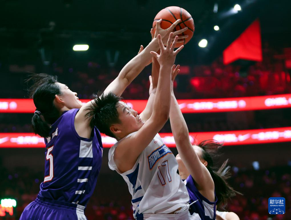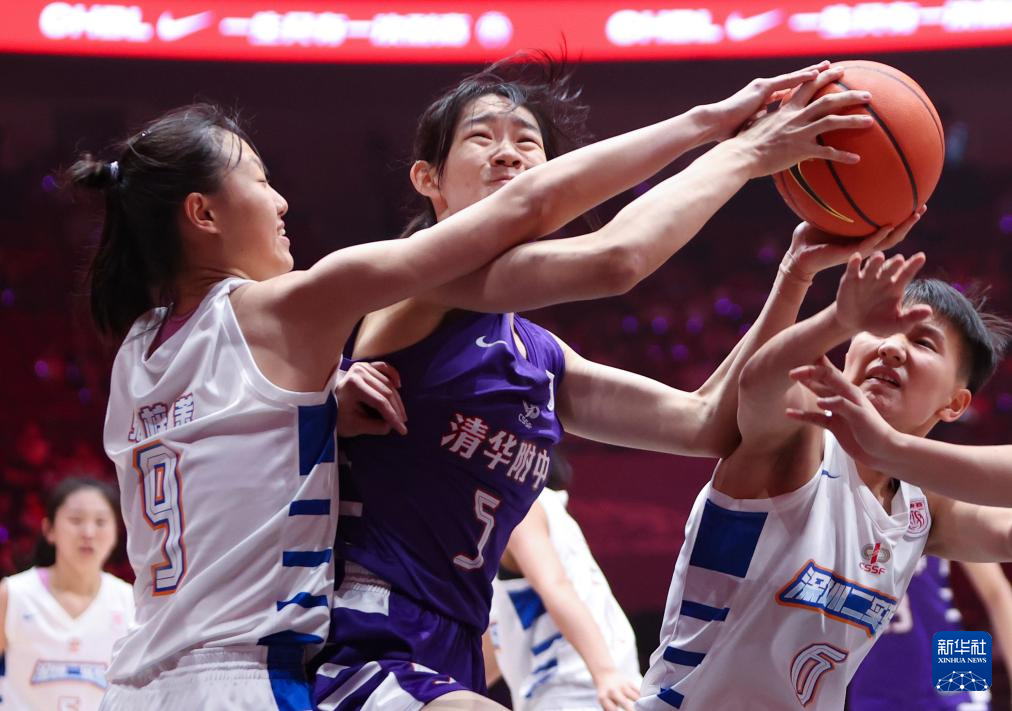 5月25日,清华大学附属中学队球员梁雅琦(中)在比赛中上篮受阻。