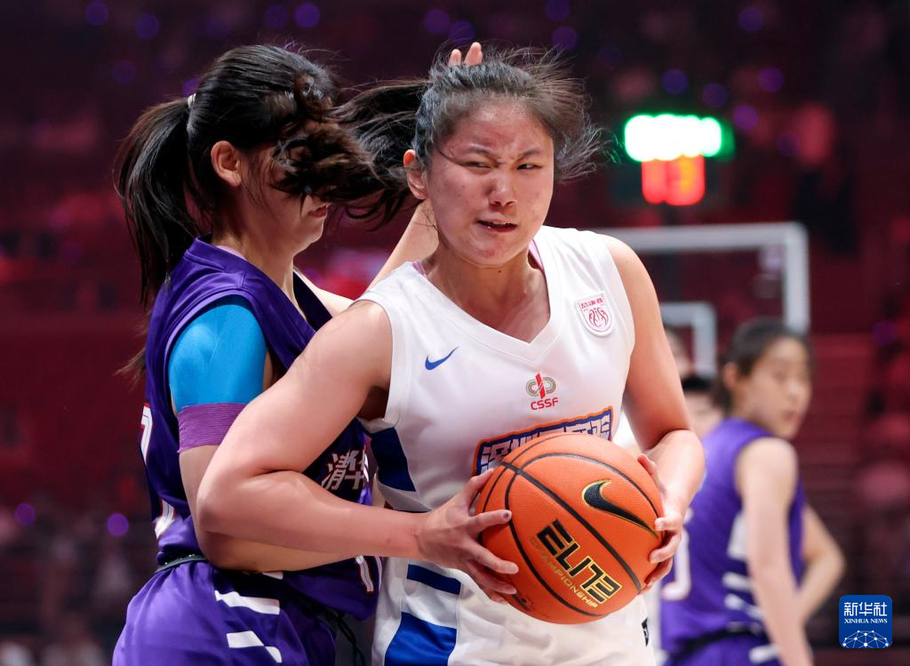 5月25日,清华大学附属中学队球员蒋紫涵(中)在比赛中投篮。