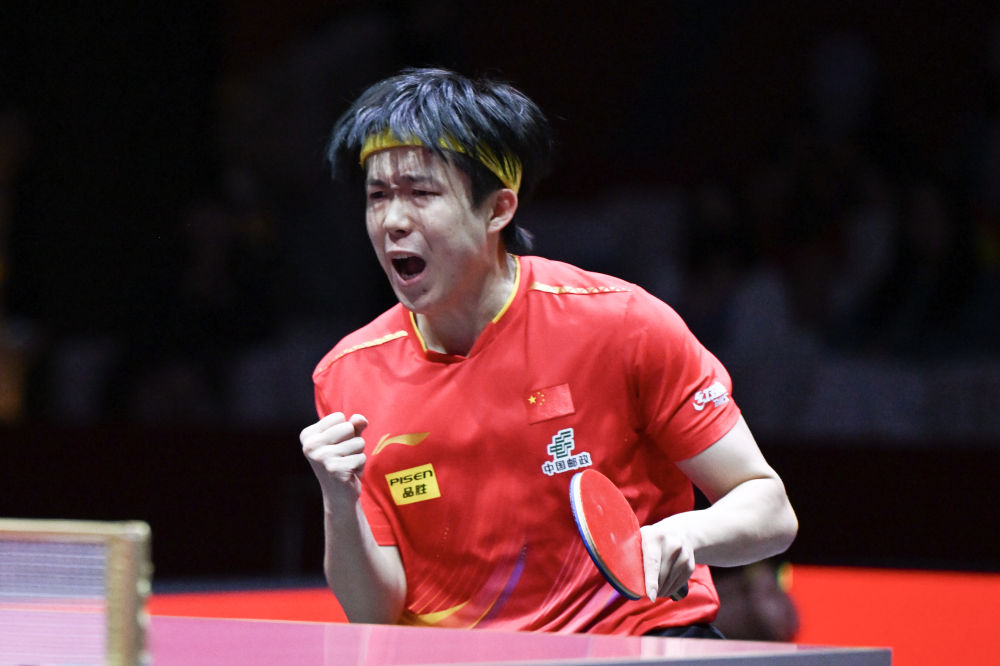 ↑王楚钦在比赛中庆祝得分。新华社记者 贺长山 摄