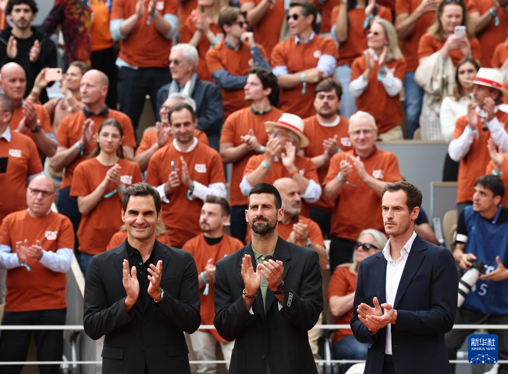 5月25日,费德勒、焦科维奇和穆雷(从左至右)在致敬仪式上。