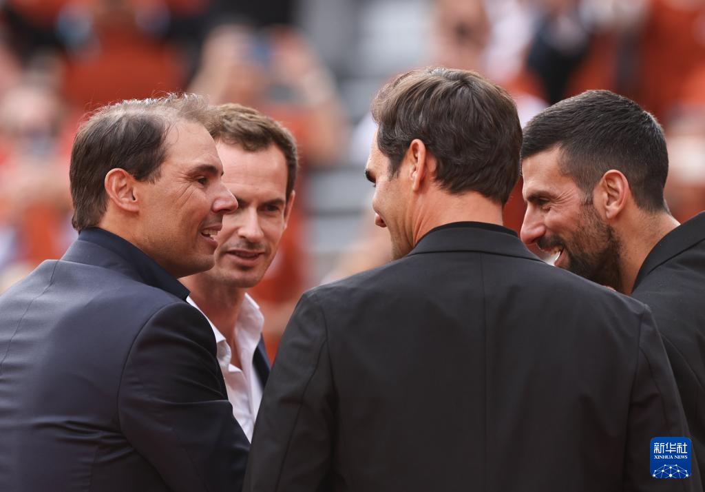 5月25日,纳达尔、穆雷、费德勒和焦科维奇(从左至右)在致敬仪式上交谈。