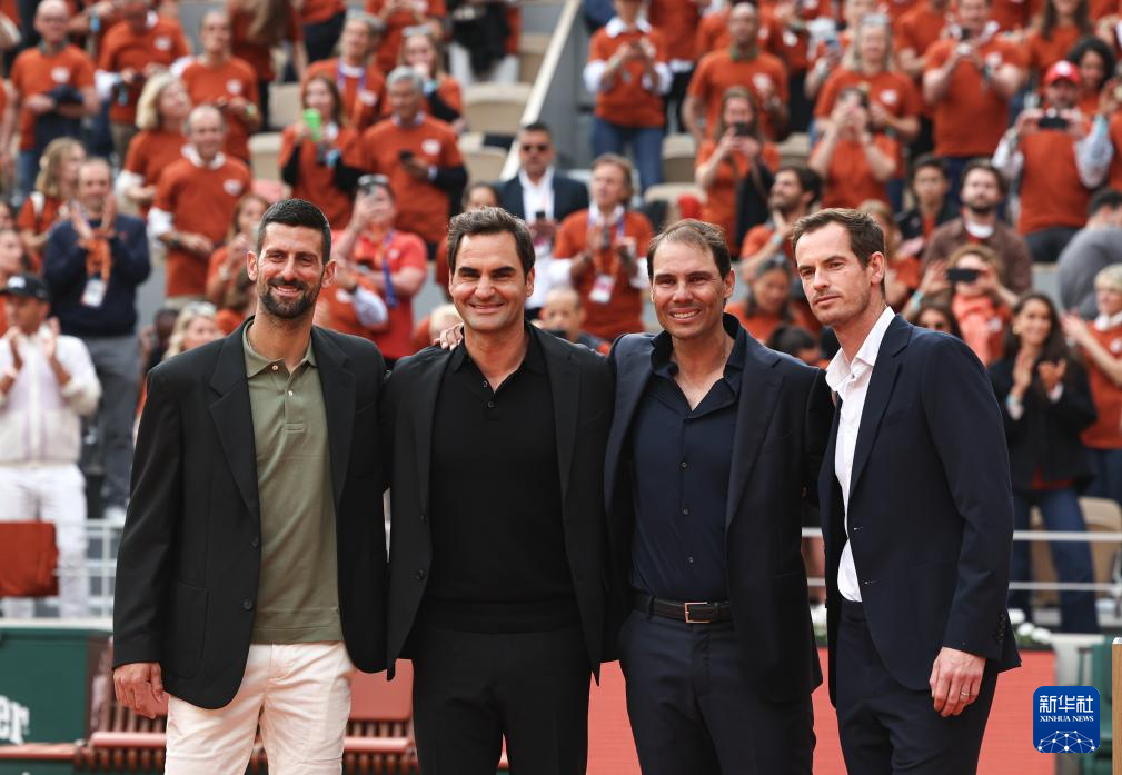 5月25日,焦科维奇、费德勒、纳达尔和穆雷(从左至右)在致敬仪式上合影。