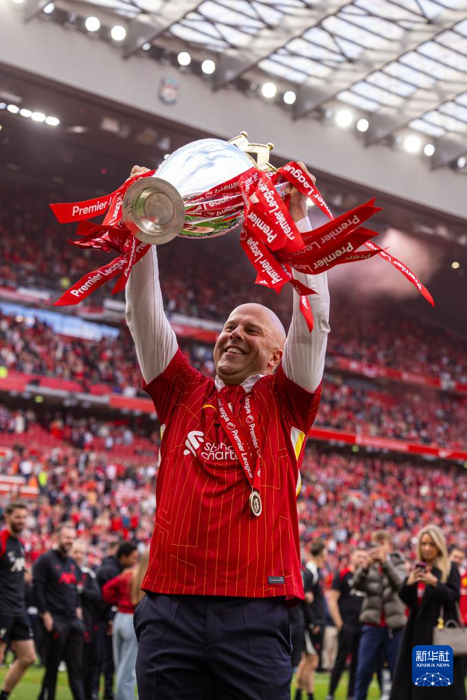 5月25日,利物浦队主教练斯洛特高举冠军奖杯庆祝。