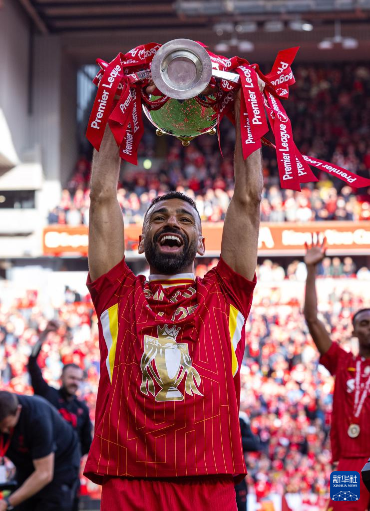 5月25日,利物浦队球员萨拉赫高举冠军奖杯庆祝。