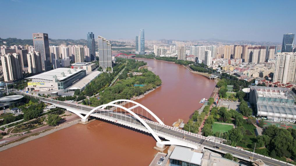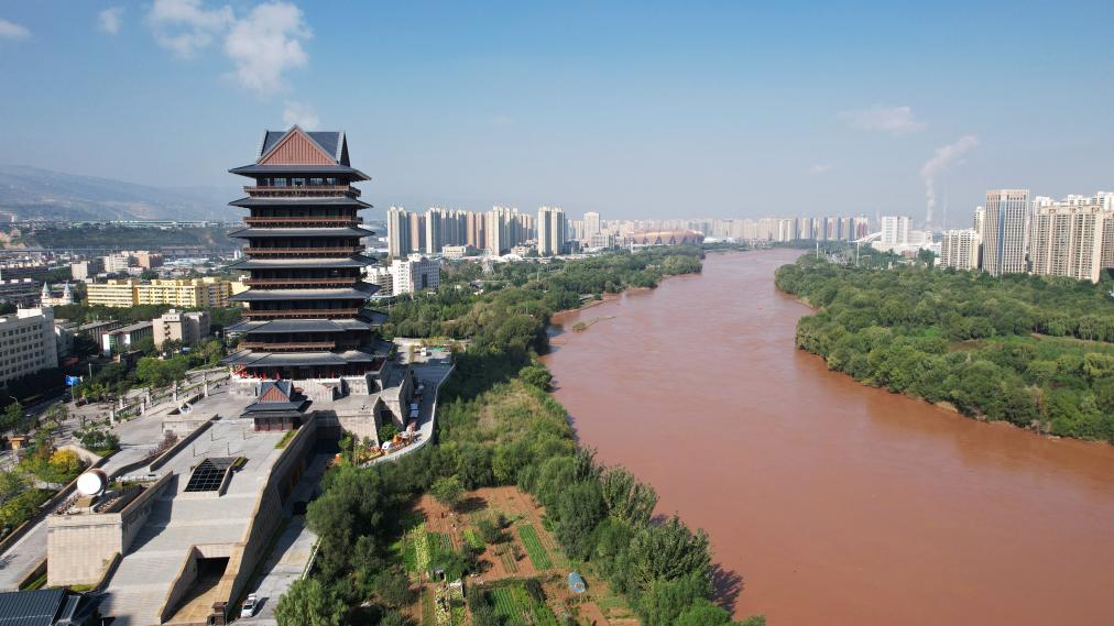 ↑位于黄河兰州段南岸的黄河楼。新华社记者陈斌摄