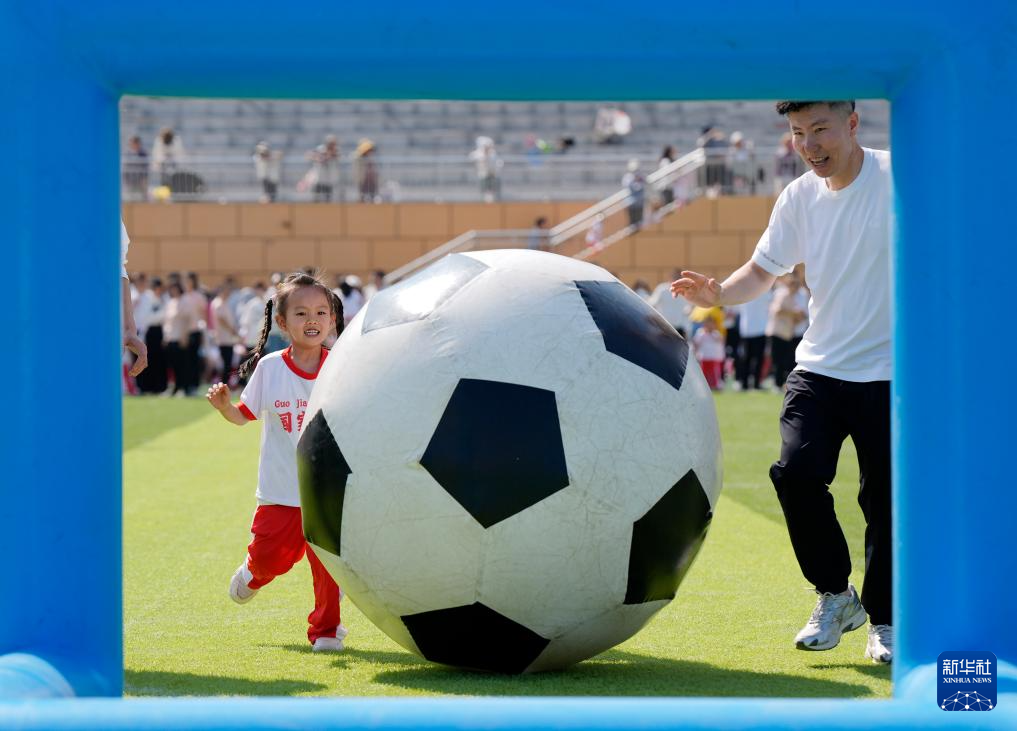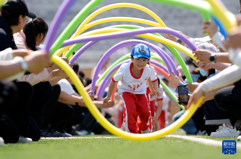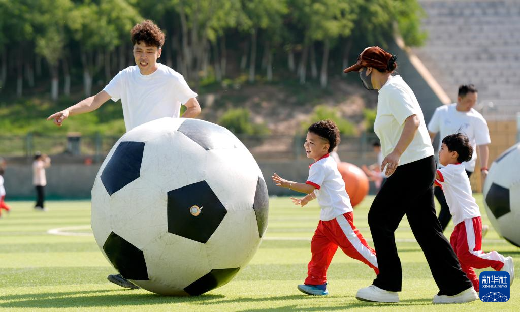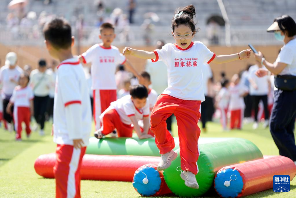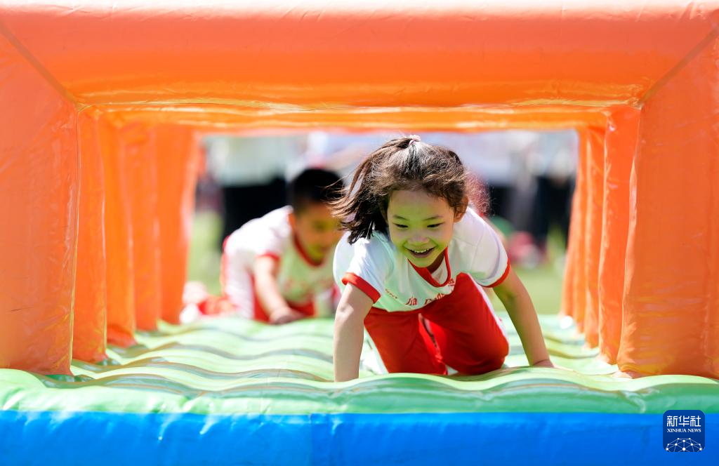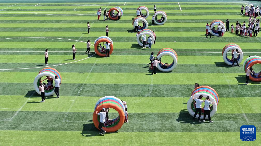 5月27日,家长与孩子们在活动中参与亲子游戏(无人机照片)。