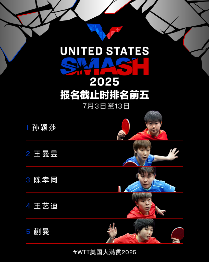 新华社北京5月29日电 世界乒乓球职业大联盟(WTT)美国大满贯赛将于7月3日至13日在拉斯维加斯举行。首批参赛名单29日公布,多哈世乒赛单打冠军王楚钦、孙颖莎等多位名将在列。
