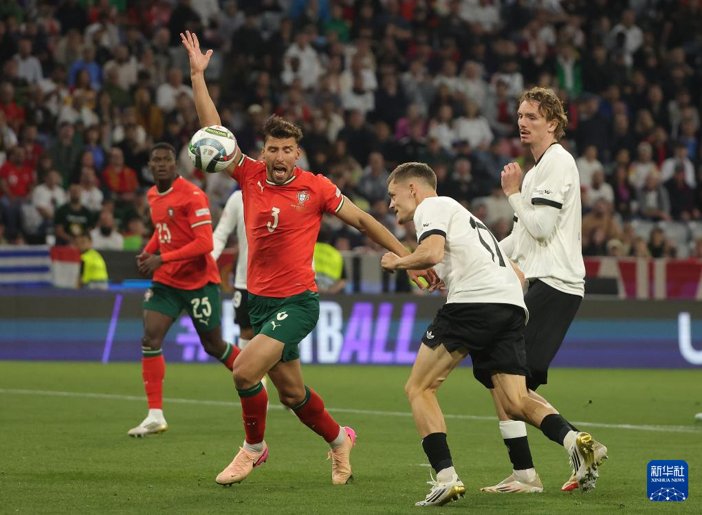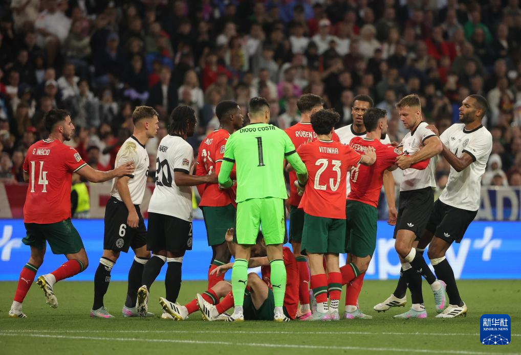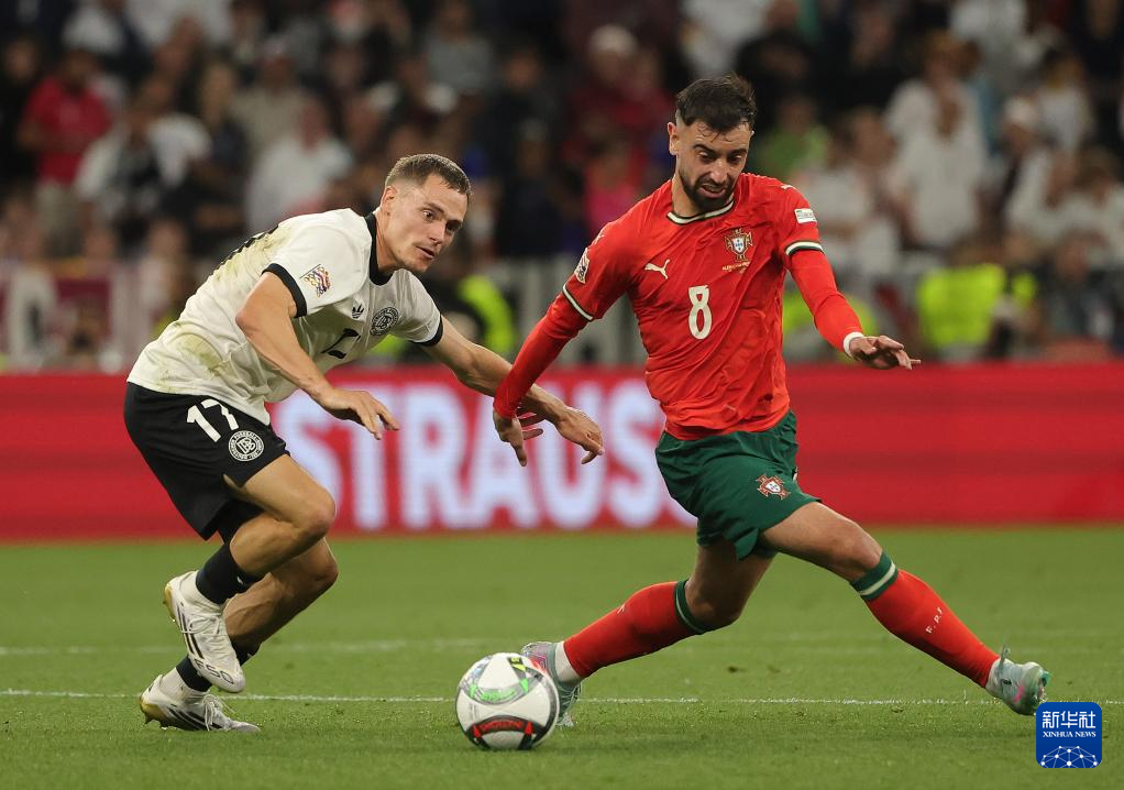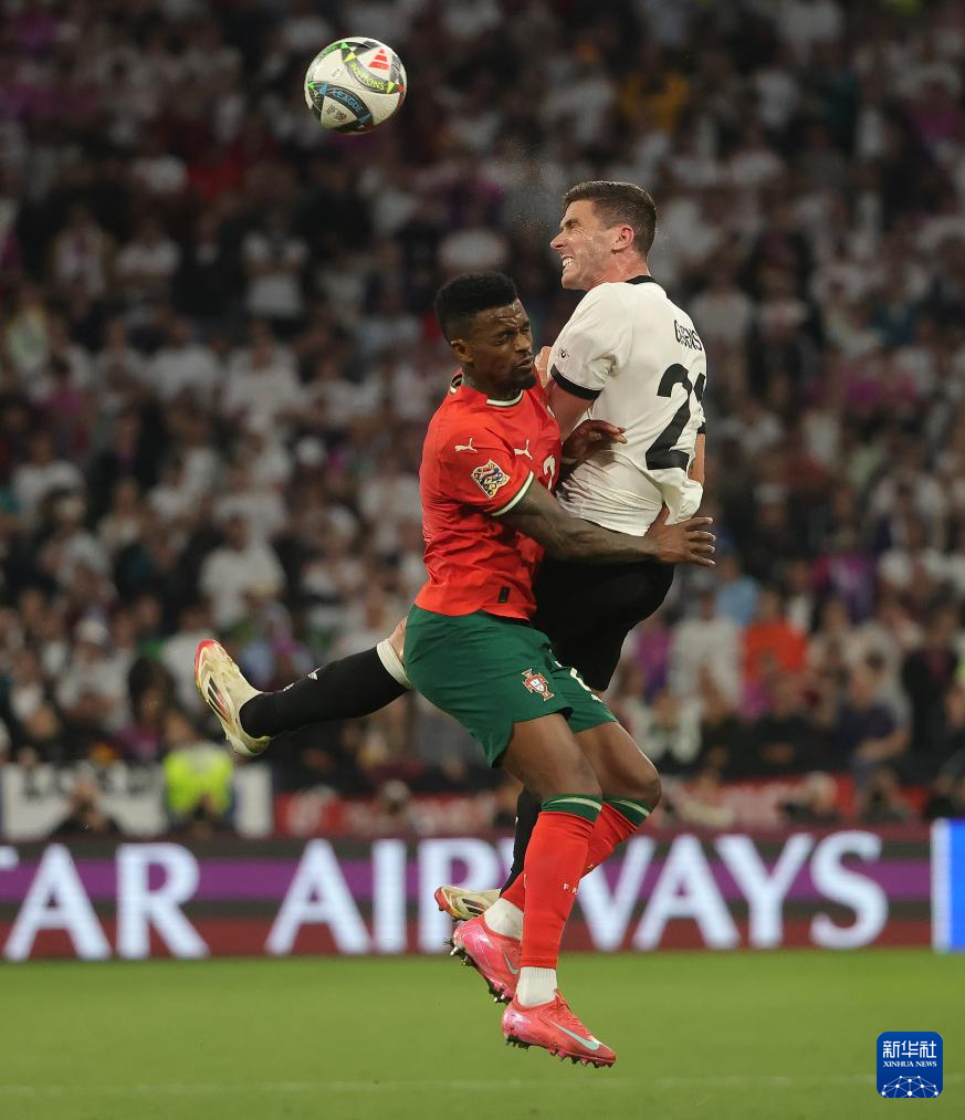 6月4日,德国队球员维尔茨(左)与葡萄牙队球员布鲁诺·费尔南德斯在比赛中拼抢。