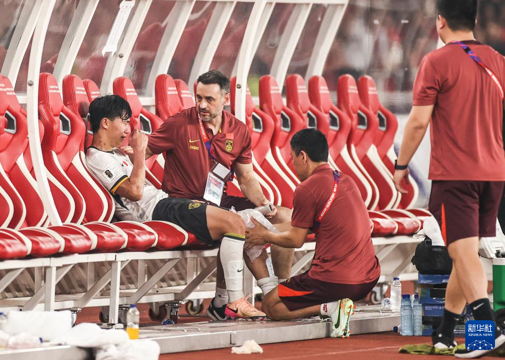 6月5日,中国队球员朱辰杰(左二)在比赛中被队医搀扶下场。