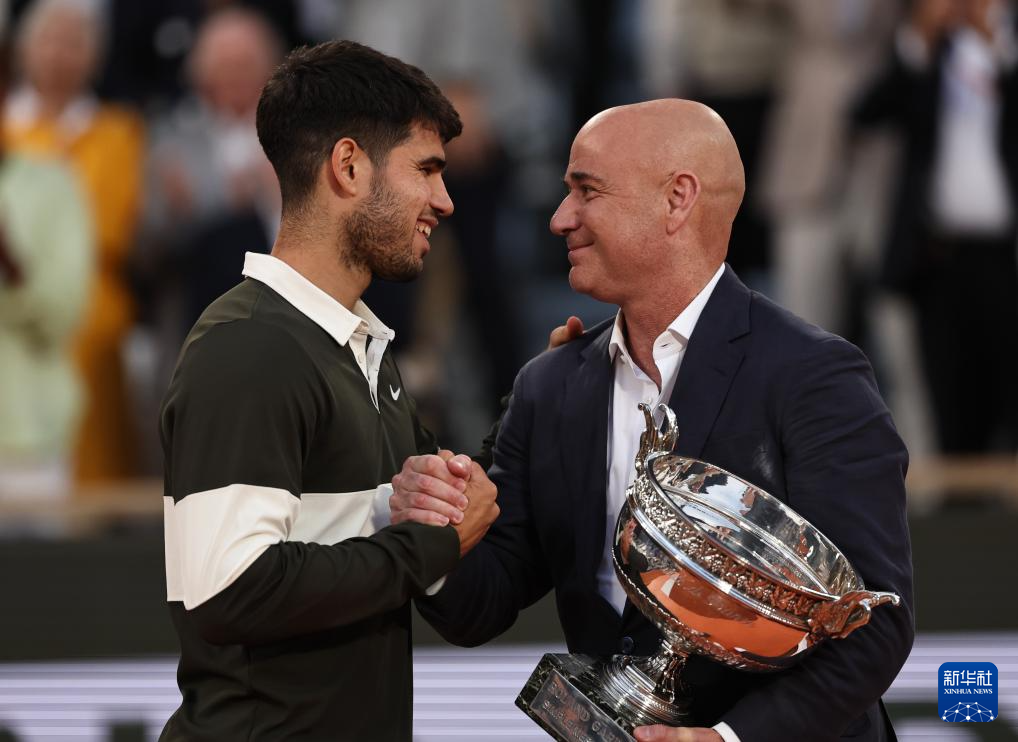 6月8日,网球名宿阿加西(右)为阿尔卡拉斯颁奖。