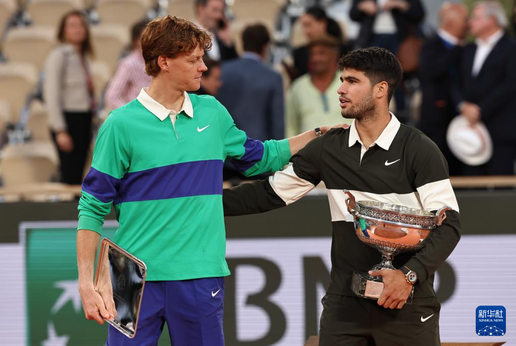 6月8日,阿尔卡拉斯(右)和辛纳在颁奖仪式上。