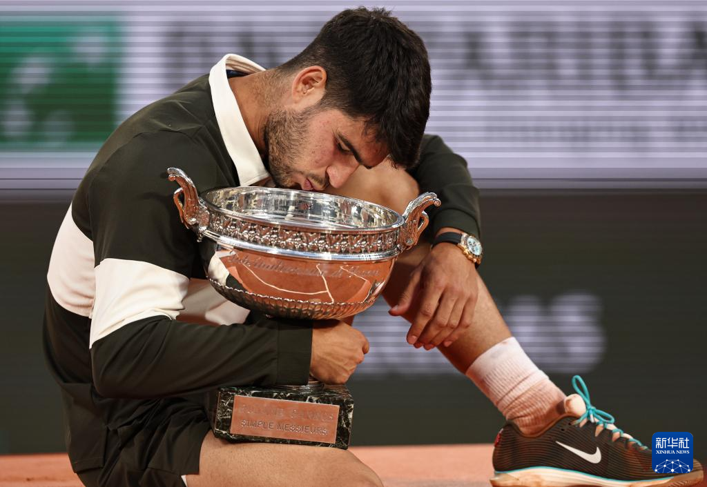 6月8日,阿尔卡拉斯在拍照仪式上亲吻奖杯。