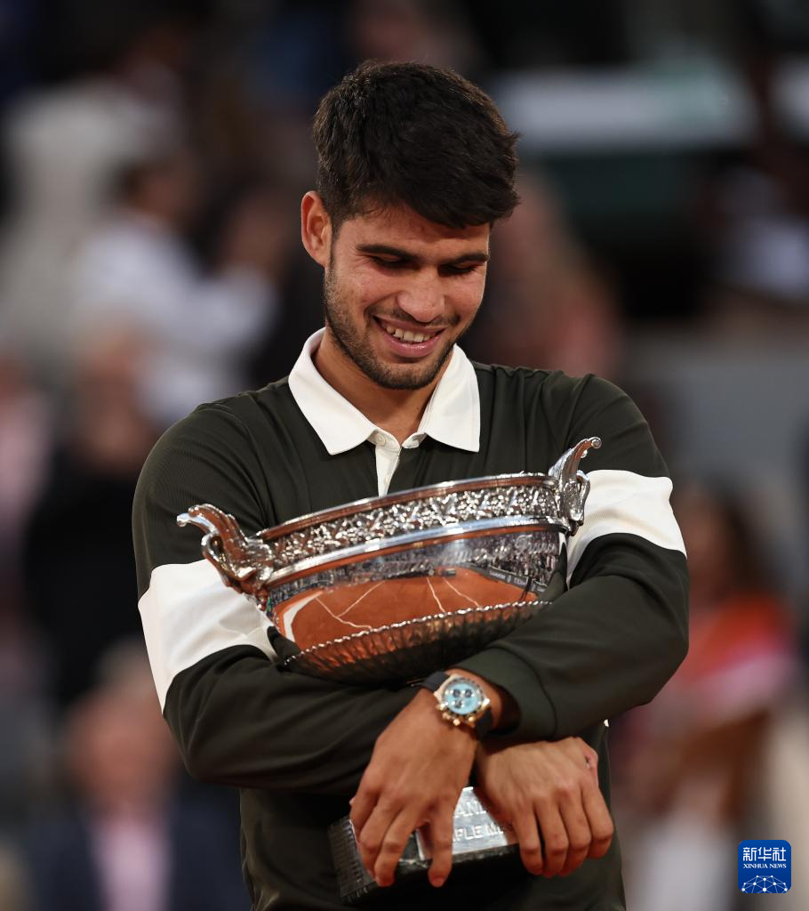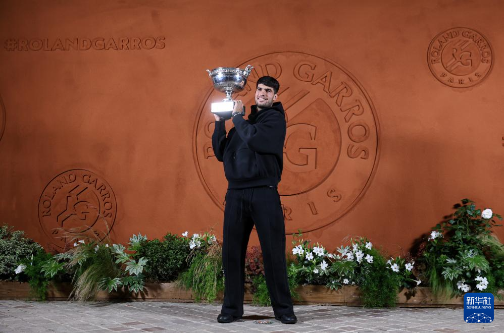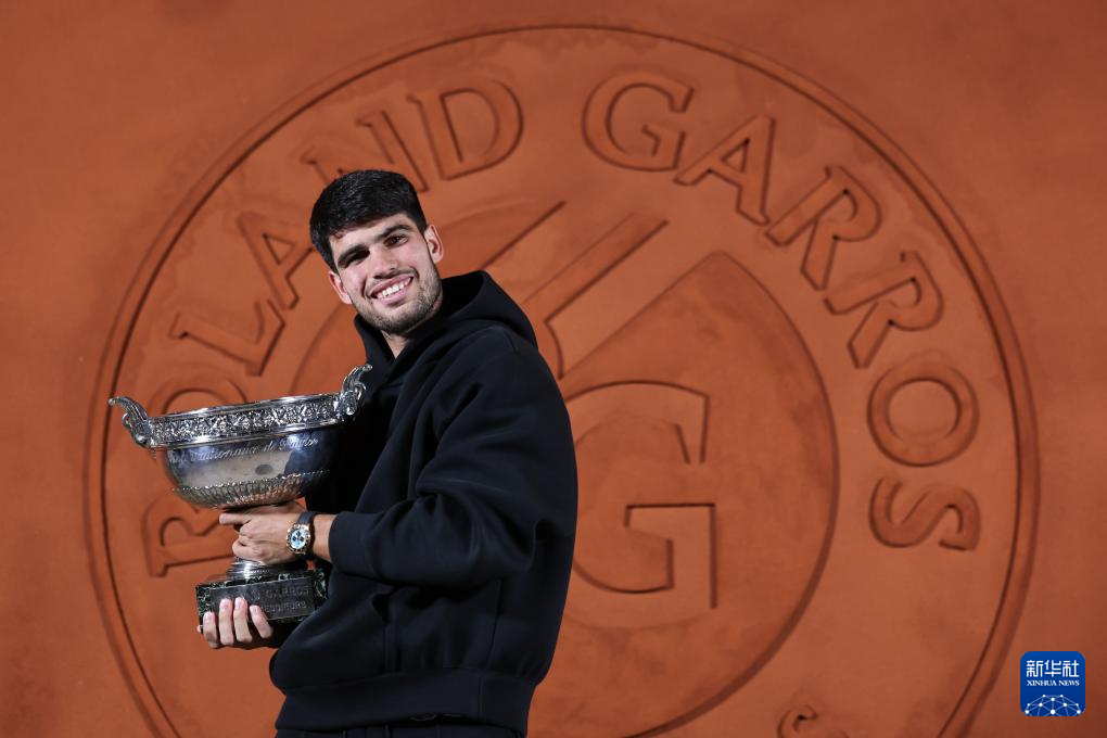 6月8日,阿尔卡拉斯在拍照仪式上与奖杯合影。