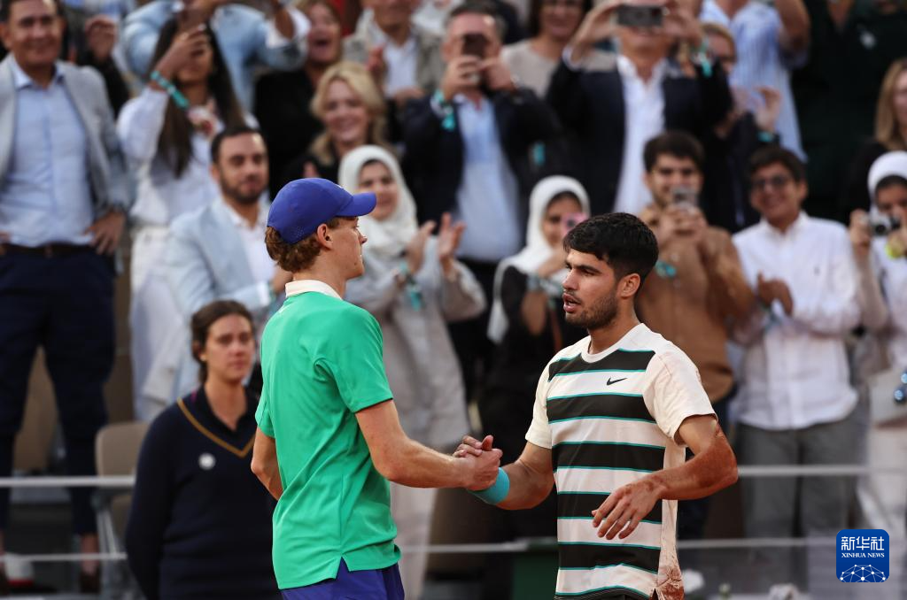 6月8日,阿尔卡拉斯(右)和辛纳在赛后握手致意。