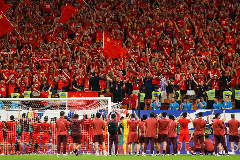 6月10日,中国队成员在获胜后向球迷致意。新华社记者 胡星宇 摄