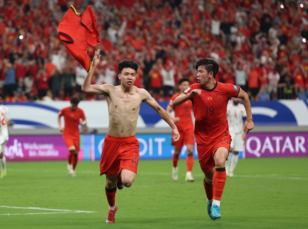6月10日,中国队球员王钰栋(左)罚进点球后庆祝。新华社记者 胡星宇 摄