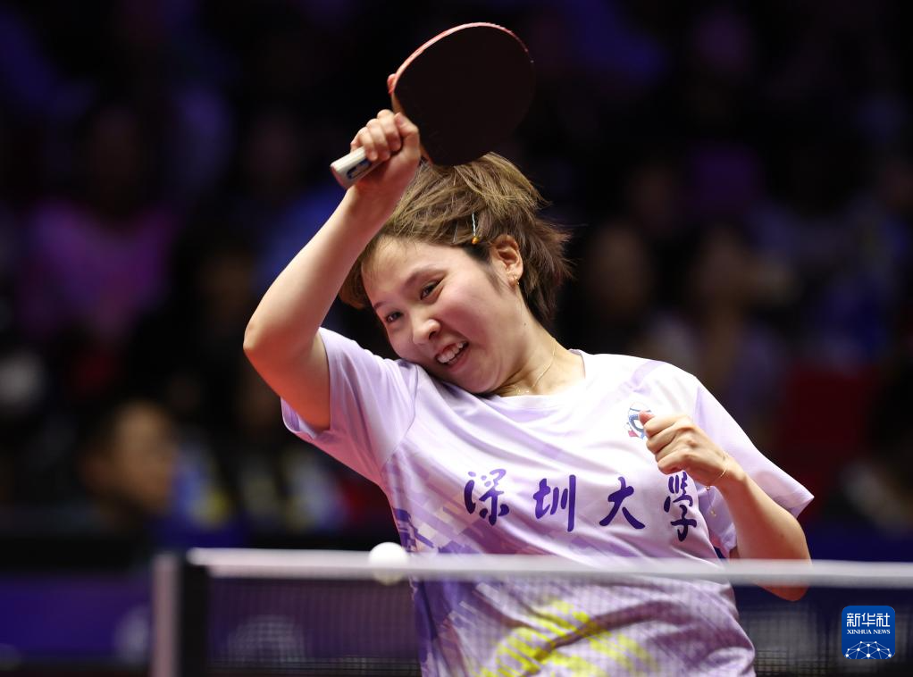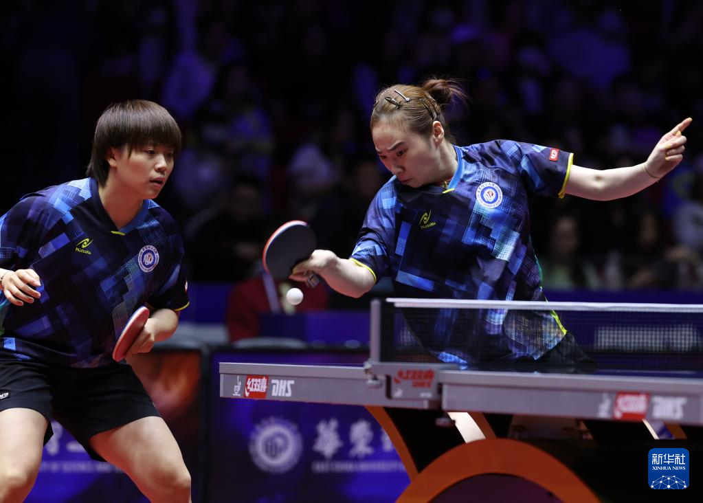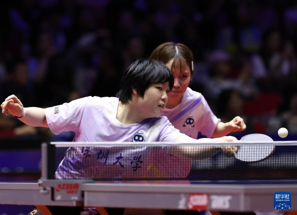 6月11日,深圳大学队组合蒯曼(左)/平野美宇在比赛中。她们在双打比赛中3比0战胜华东理工大学队组合张翔宇/王晓彤。